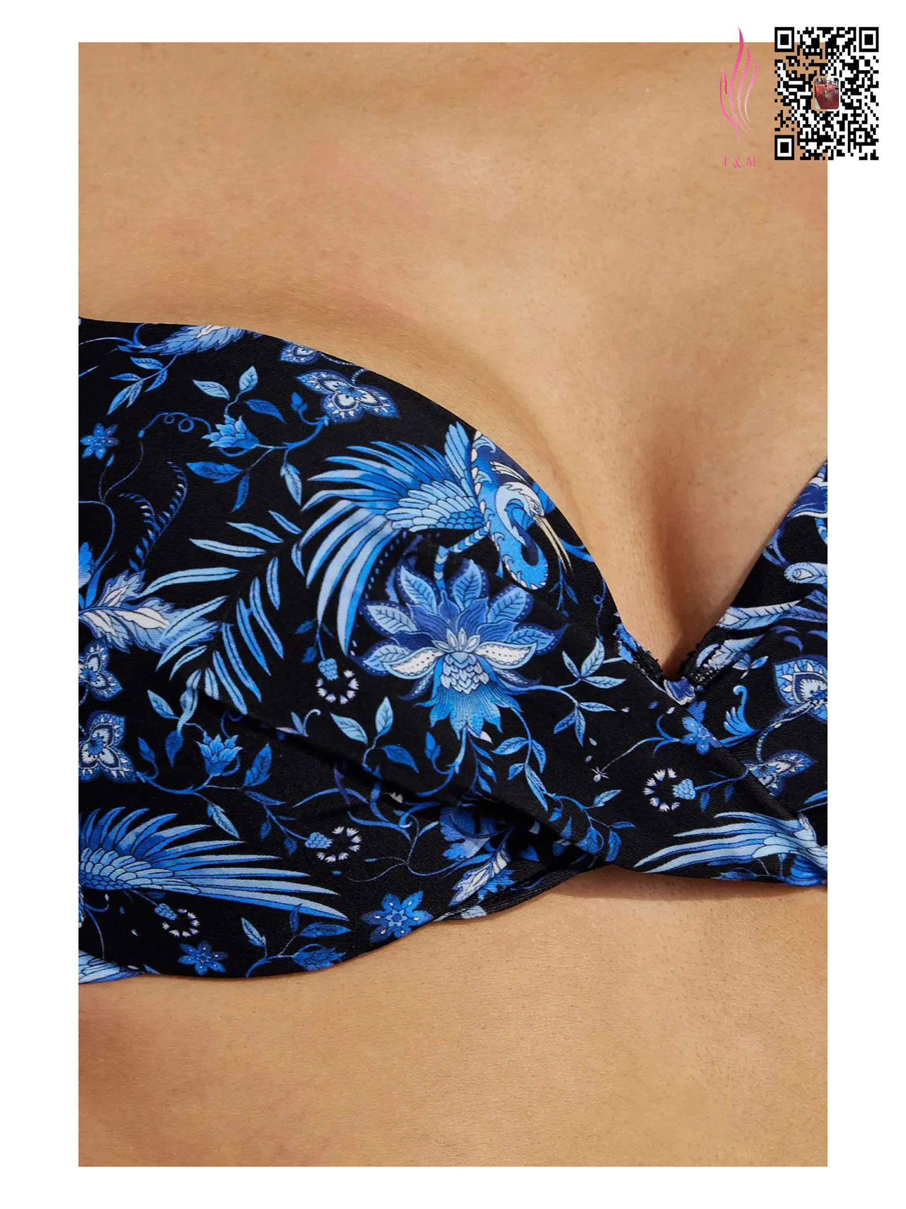 This bikini set features a trendy blue - white floral print, with a design that combines comfort, support, and stylish details: